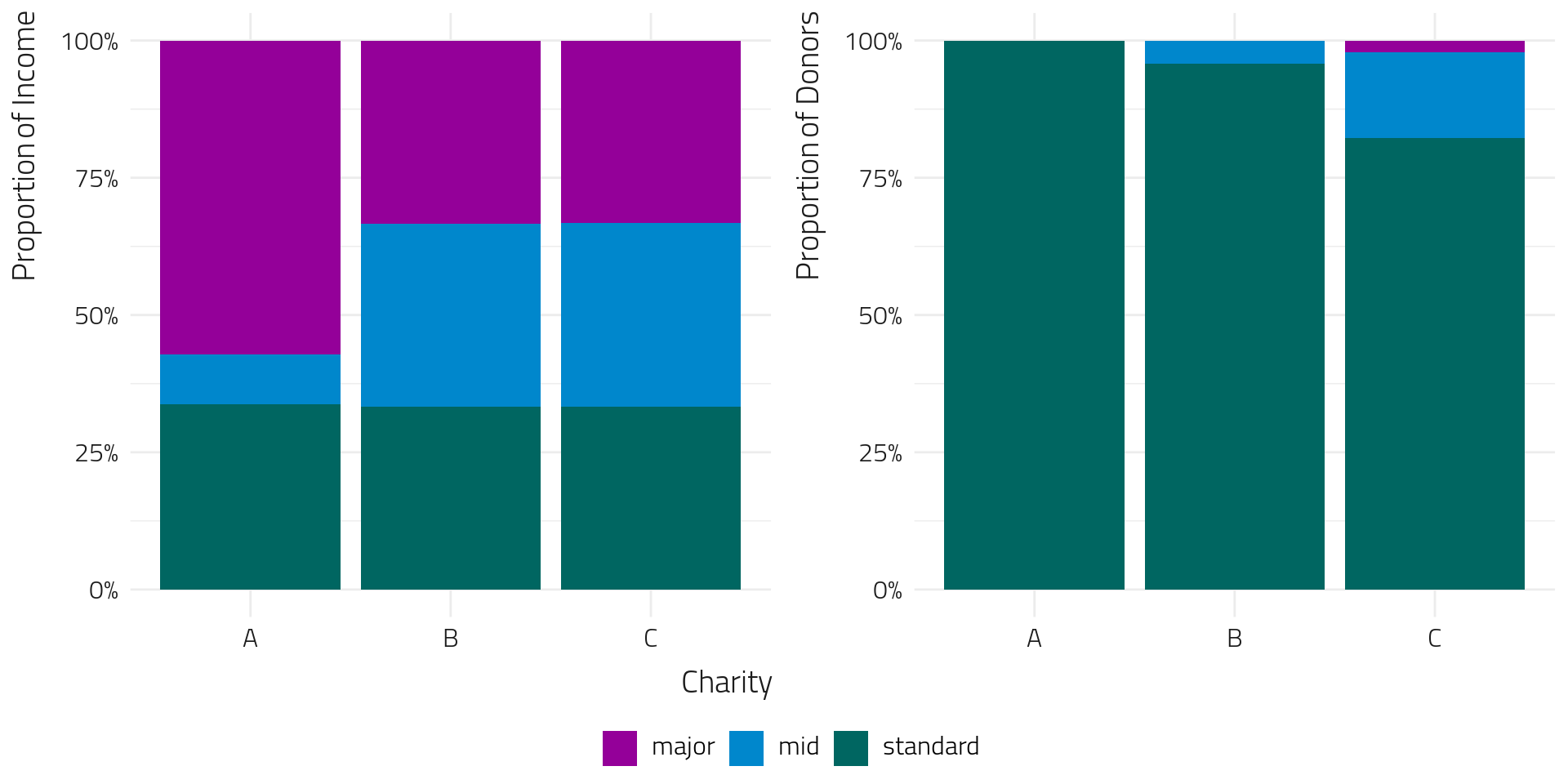 We can also think of this as ensuring “fairness” between standard-value, mid-value, and high-value programs since each contributes more evenly to the overall income. The chart below shows that charity A can’t share revenue evenly across the different value cohorts due to one exceptionally generous gift. However, our other two charities allow us to see an even balance of income in the left-hand chart. The right-hand graph shows the complementary view of donor proportions to achieve a balanced revenue split between standard-value, mid-value and high-value donors.