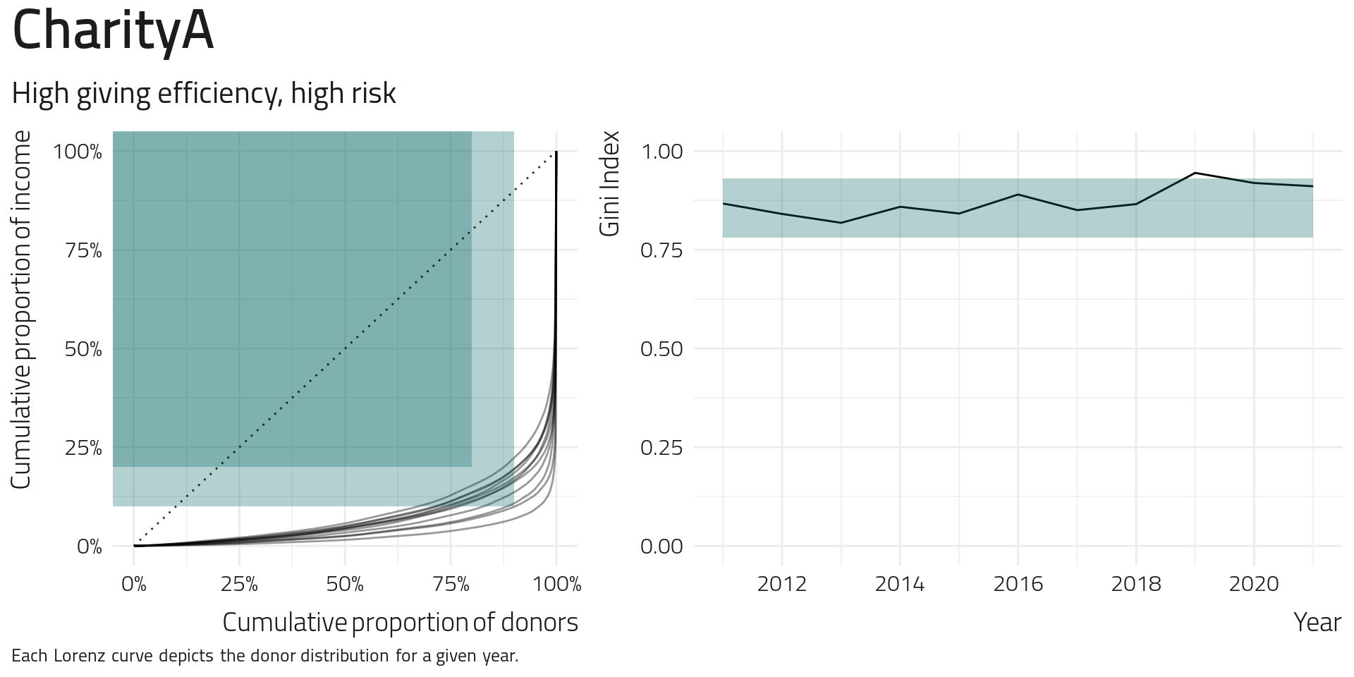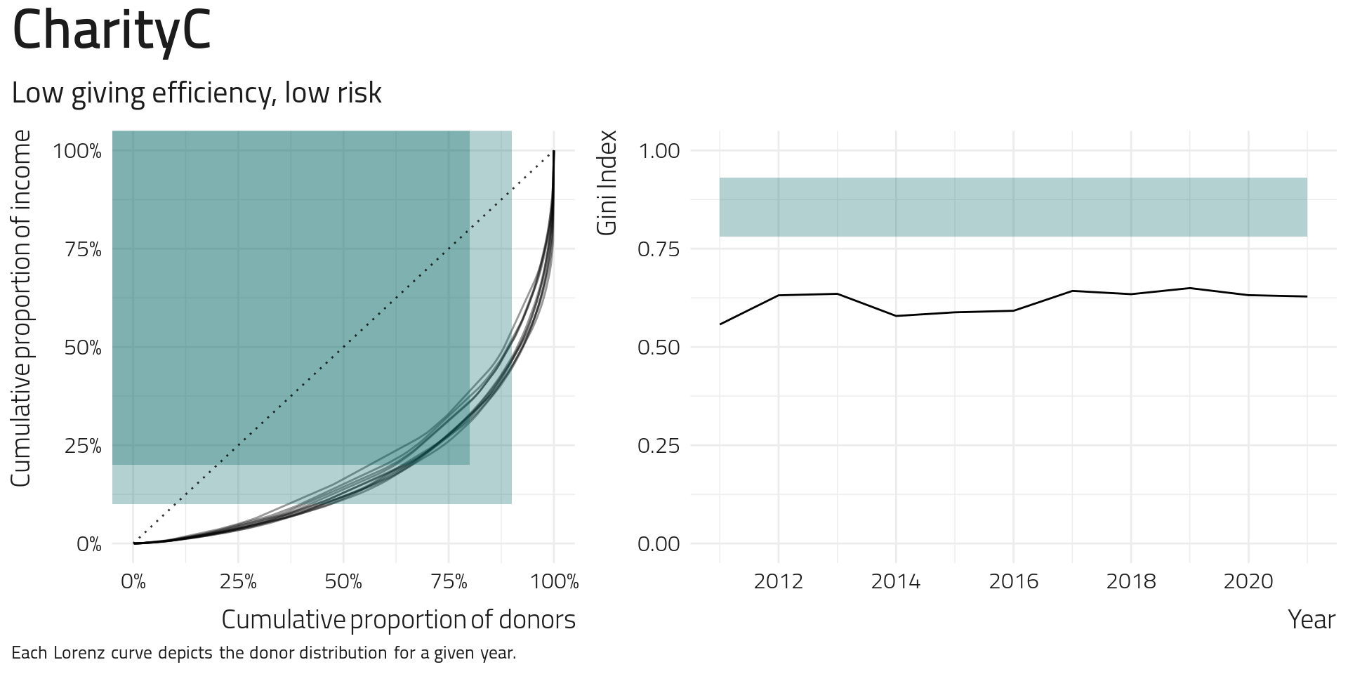 Finally, Charity C has a reasonably stable set of Lorenz curves in the plot’s low efficiency, low-risk area. The Gini Index was high in the past (2012-13) and has seen a fall and subsequent increase since then. The growth has plateaued in the last year, indicating that high-value giving isn’t increasing relative to other donors.