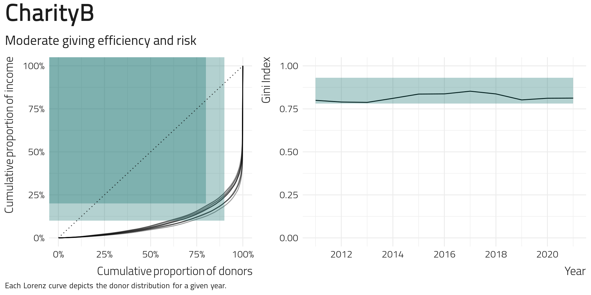 Looking to Charity B, we see much tighter Lorenz curves and less variation in the Gini Index over the years. This charity’s Gini Index seems to have increased partially between 2014 and 2018 from greater focus or reliance on high-value givers, but this reduced in 2019 and has been stable since.